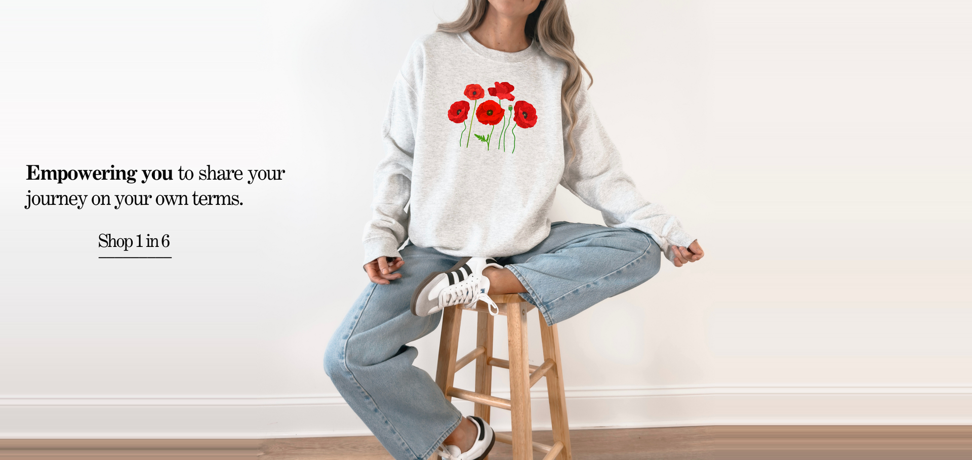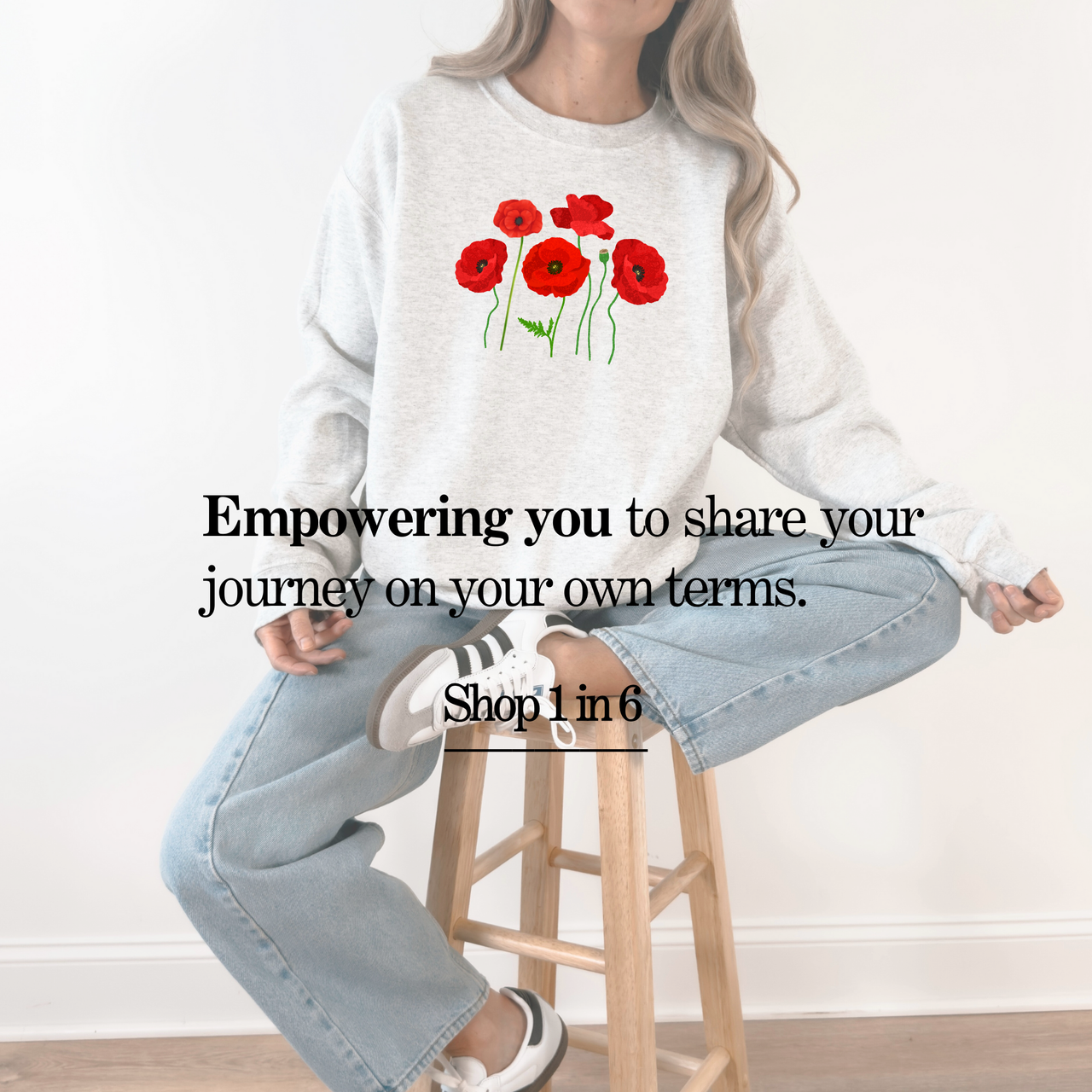 Woman wearing a gray sweatshirt with a 1 in 4 cascading heart print design, sitting against a white tiled wall.