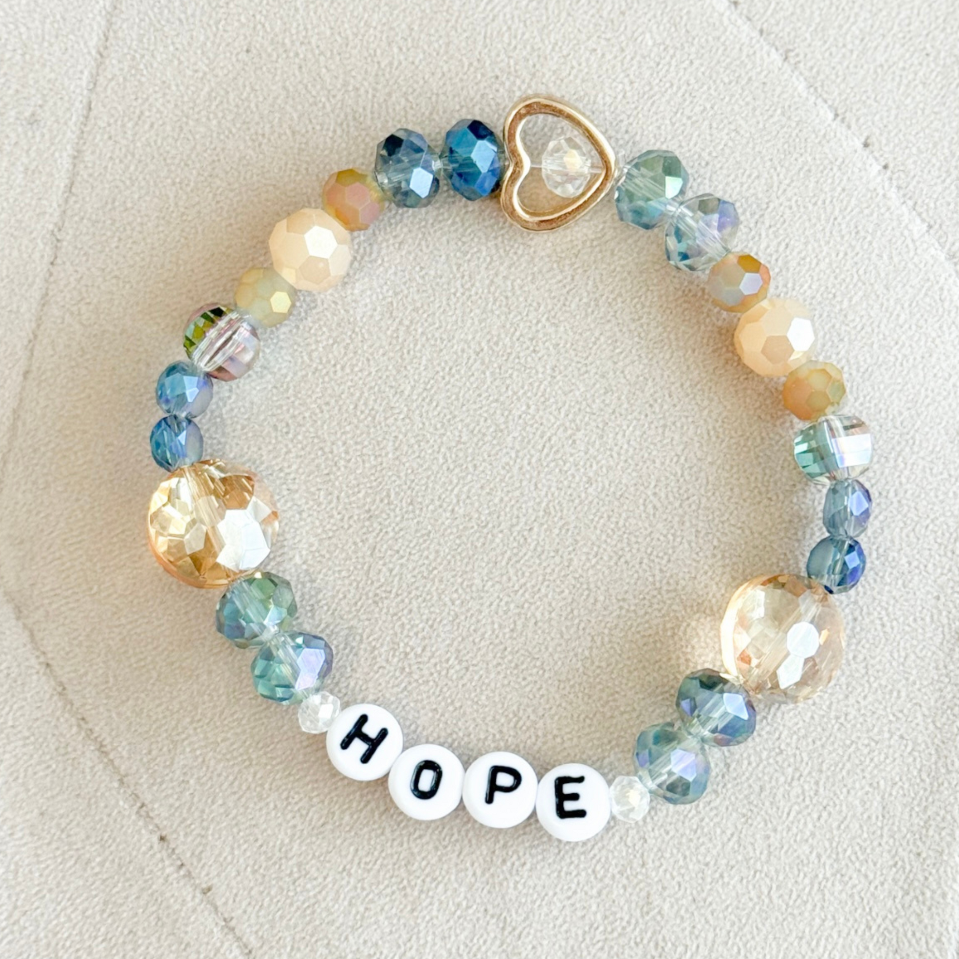 Carry a reminder of light and possibility with you. This handmade bracelet features shimmering faceted beads in soothing shades of blue, gold, and cream—balanced with a golden heart charm and the word HOPE spelled in classic letter beads.